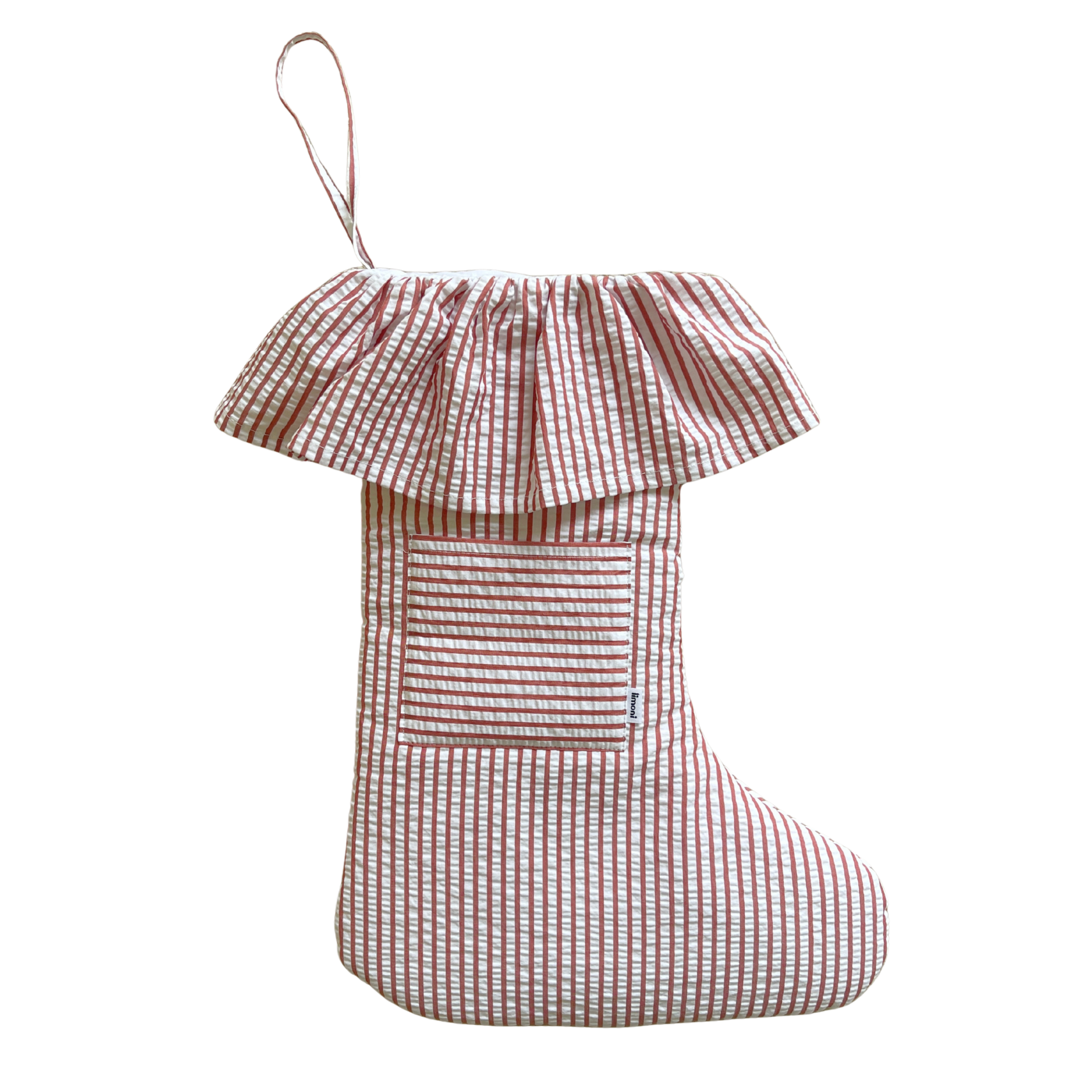 This limited-edition Limoni stocking is crafted from a striped cotton seersucker and is finished with a delicate ruffle and functional front pocket. Designed to be treasured year after year.